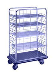 General Supply Carts, Model MEC5167 and Model LEC6367 come fully-assembled with variable shelf-adjustment. Designed for easy access, the carts come in two sizes and hold a variety of items on four, chrome-wire shelves. Wire-mesh back-screen. Steel chassis with stainless-steel bottom and wrap-around bumper for maximum protection. Four, six-inch swivel casters, one with swivel lock.