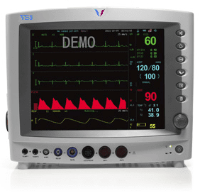 Configured vital signs monitor. Includes 3 Lead ECG, Noninvasive BP, Pulse Oximetry, Heart Rate, Respiration Rate, Temperature, Printer, Trends, Arrhythmia Detection, ST Segment Analysis.